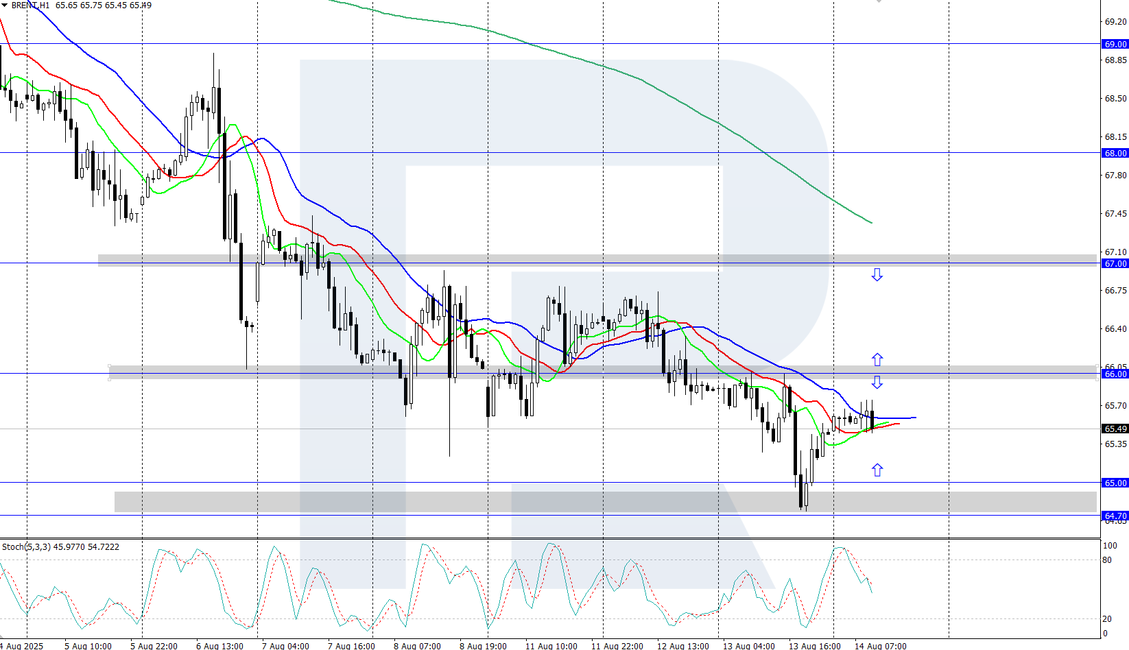 H4 графигінде Brent алдыңғы төмендеуден кейін жоғарыға бұрылуға әрекет жасауда. Alligator индикаторы да өсу ықтималдығын көрсетіп, бұл қысқа мерзімді түзетудің басталуына негіз болуы мүмкін. Негізгі қолдау аймағы 64.75–65.00 USD аралығында орналасқан.