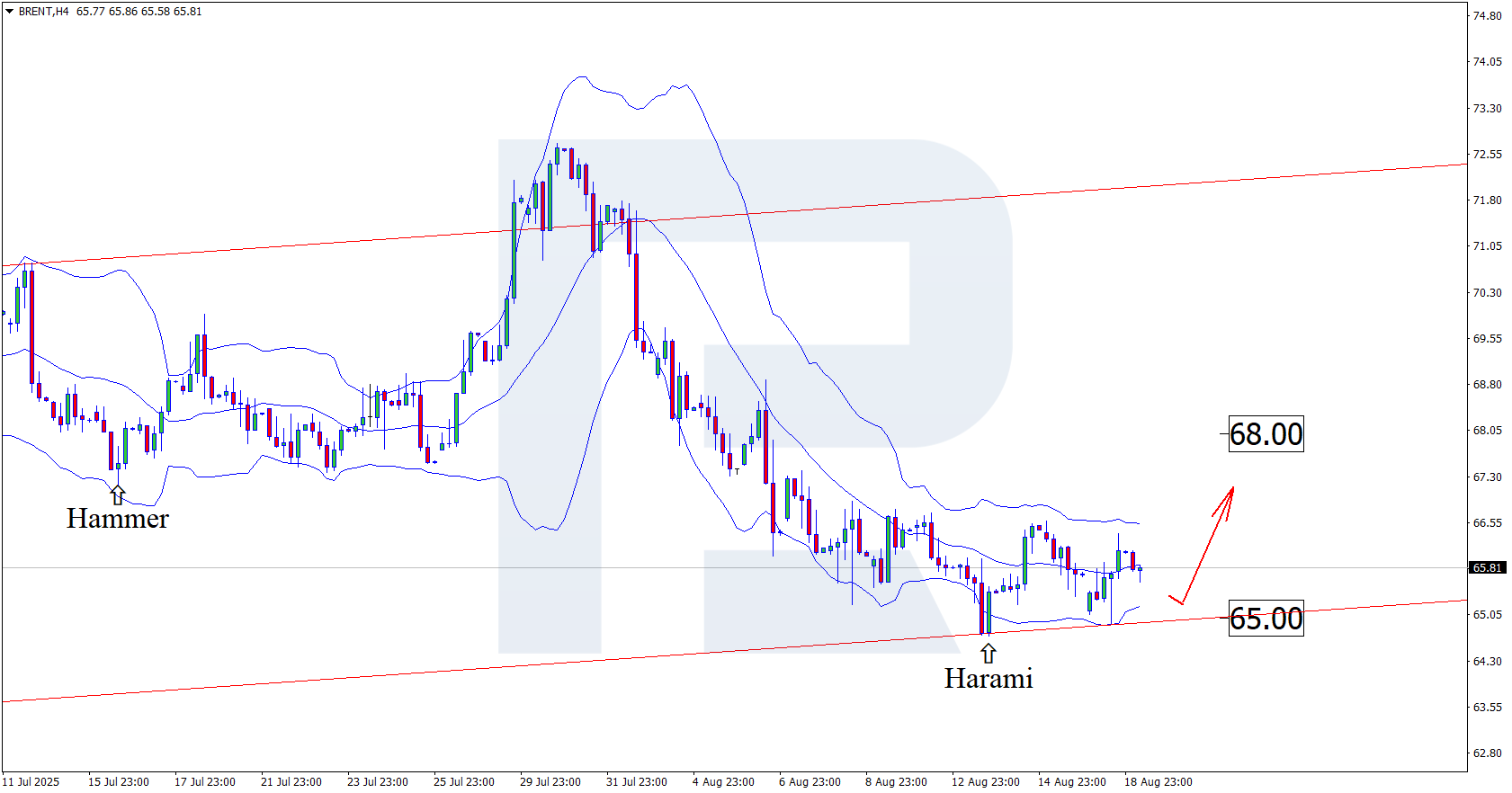2025 жылғы 19 тамыздағы Brent болжамы 68.00 АҚШ долларына дейін өсуді меңзейді. Қарсылық деңгейінен жоғары серпіліс өсу толқынының күшею перспективасын ашады.