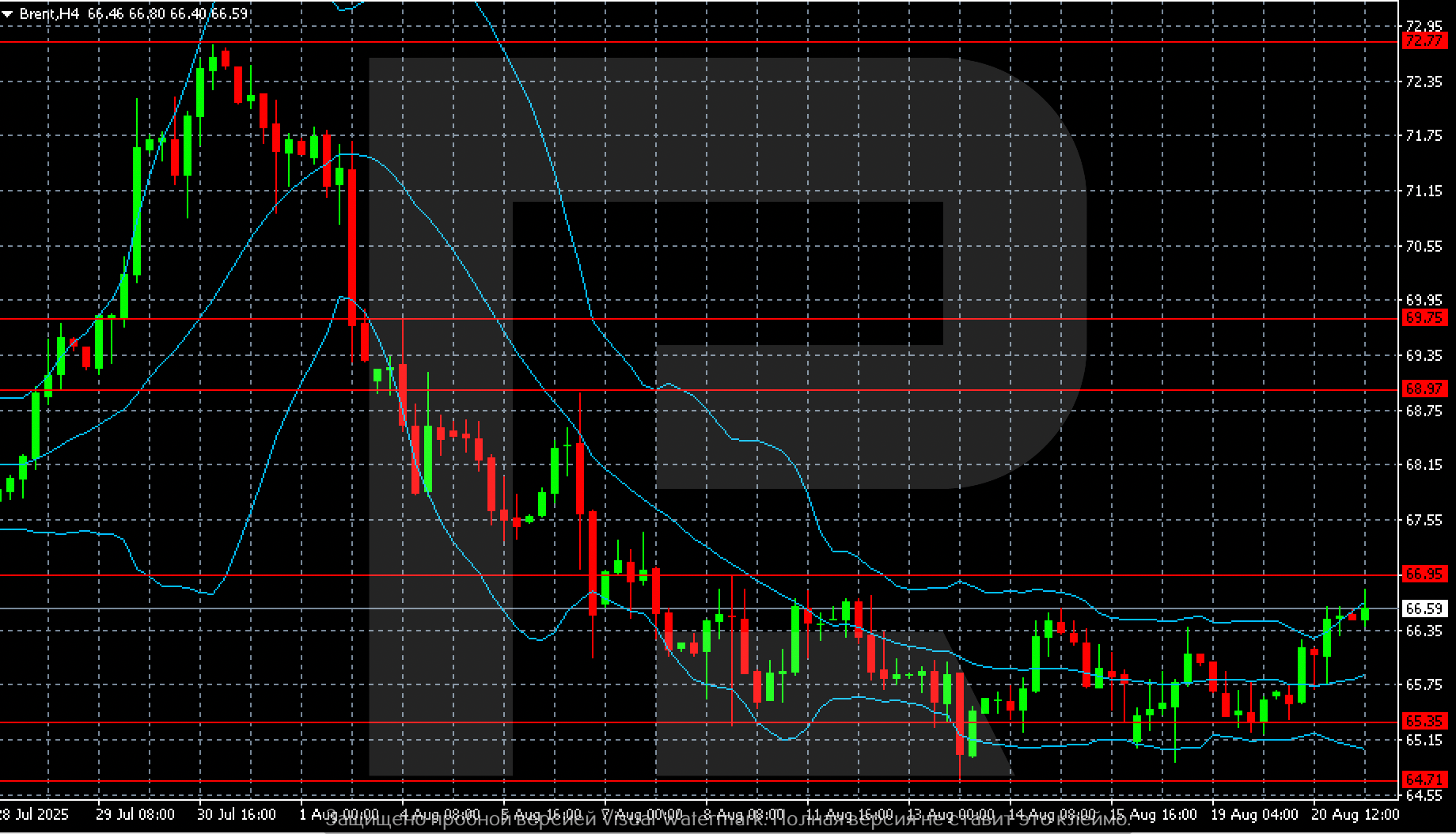 Brent маркалы мұнай бағасы қайтадан көтерілуге әрекет жасауда. 2025 жылғы 21 тамызға арналған Brent болжамы 66.90 деңгейін тестілеуді көрсетеді.