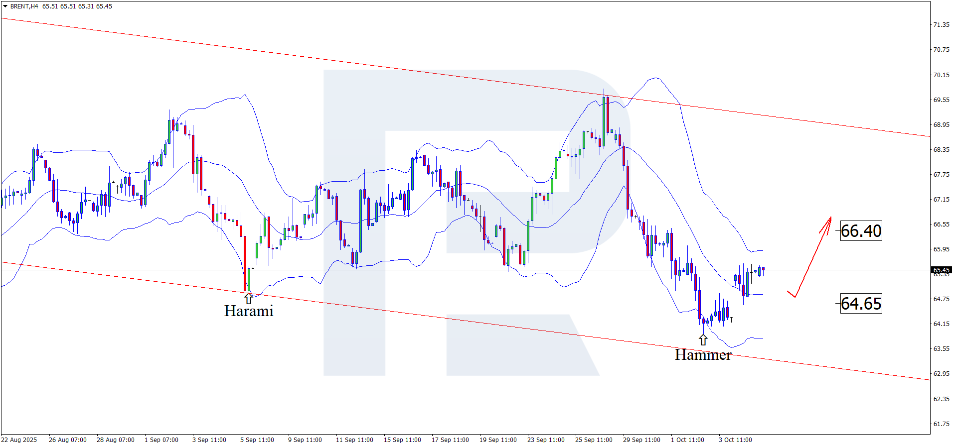 2025 жылғы 7 қазанға арналған Brent фундаменталды талдауы төмендеуден кейін бағалардың жоғары толқынды қалыптастырып, барреліне шамамен 65.40 АҚШ доллары маңында саудаланып жатқанын ескеруде.