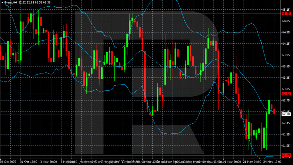 H4 графигінде Brent 12 қарашадағы күрт құлдыраудан кейін қалыптасқан төмен бағыттағы қозғалысты жалғастыруда. Бағалар қысымда қалып отыр. 62.92 қолдау деңгейін бұзғаннан кейін нарық осы деңгейден төмен бекінді және 61.29 маңындағы минимумды тестілеп үлгерді — енді бұл аймақ жергілікті қолдау ретінде қарастырылады.