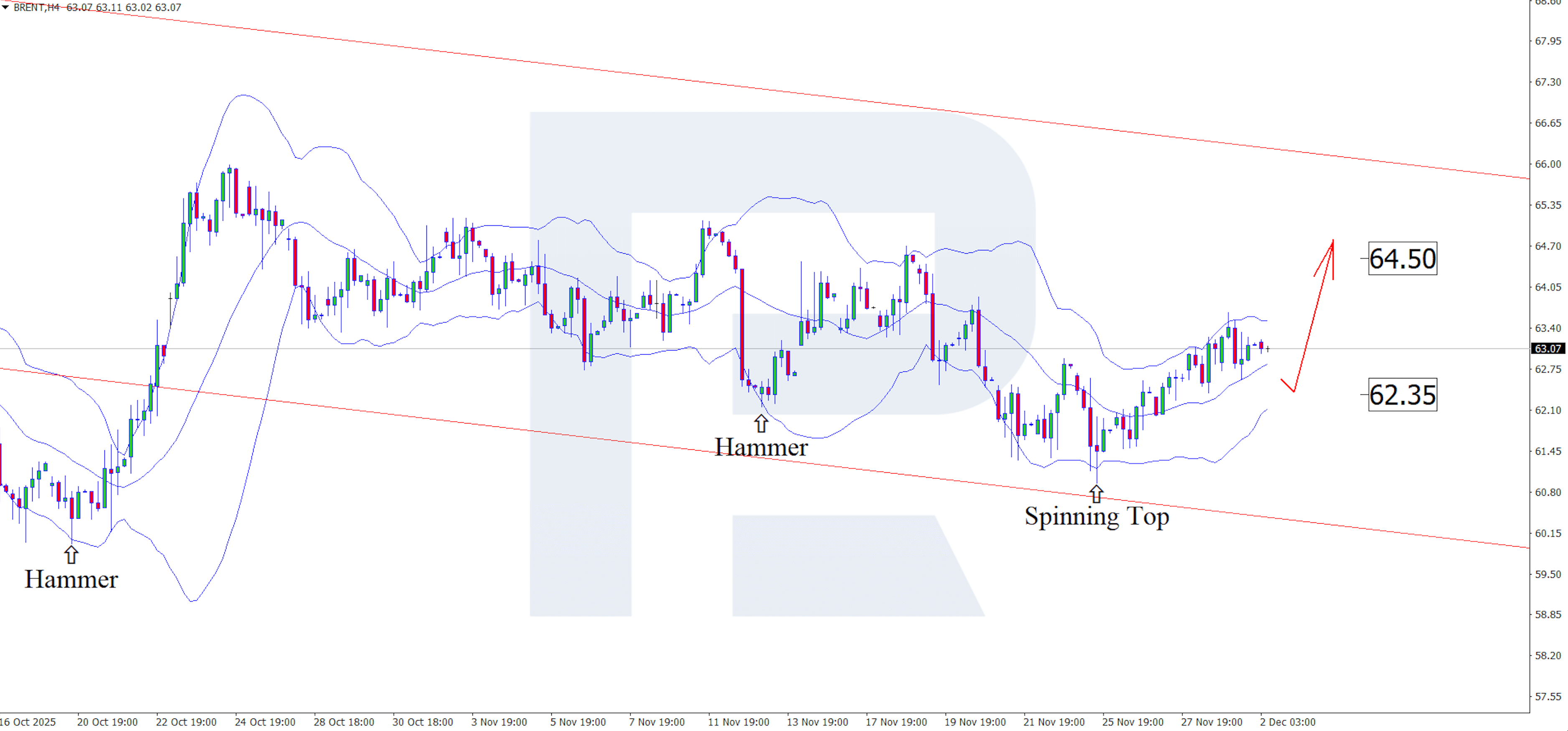 Төменгі Bollinger жолағын тестілегеннен кейін, Brent котировкалары H4 графигінде Spinning Top (Айналмалы шам) кері бұрылу үлгісін қалыптастырды. Қазір олар осы сигналға ілесе отырып, «бычий» толқын түзуде.