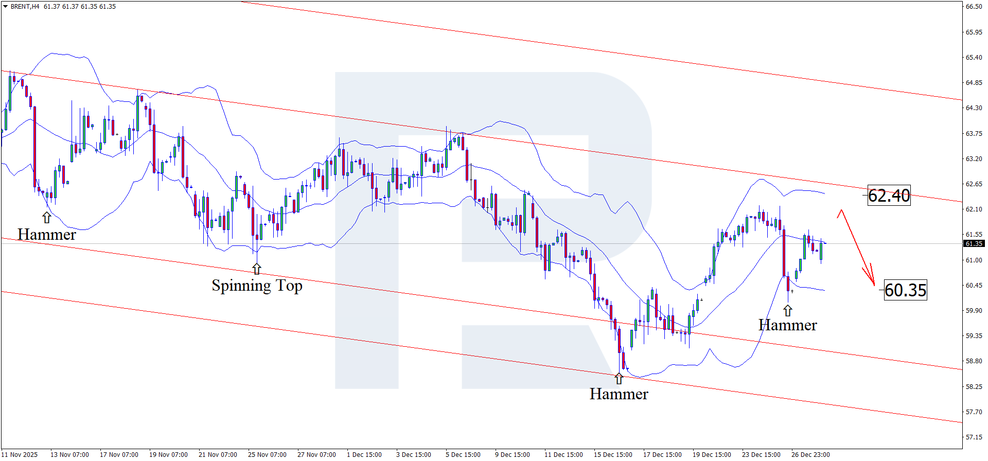 2025 жылғы 30 желтоқсанға арналған Brent бойынша фундаменталды болжам бағалардың түзетуші толқынды қалыптастырып, баррель үшін шамамен 61.30 USD деңгейінде саудаланып жатқанын көрсетеді.