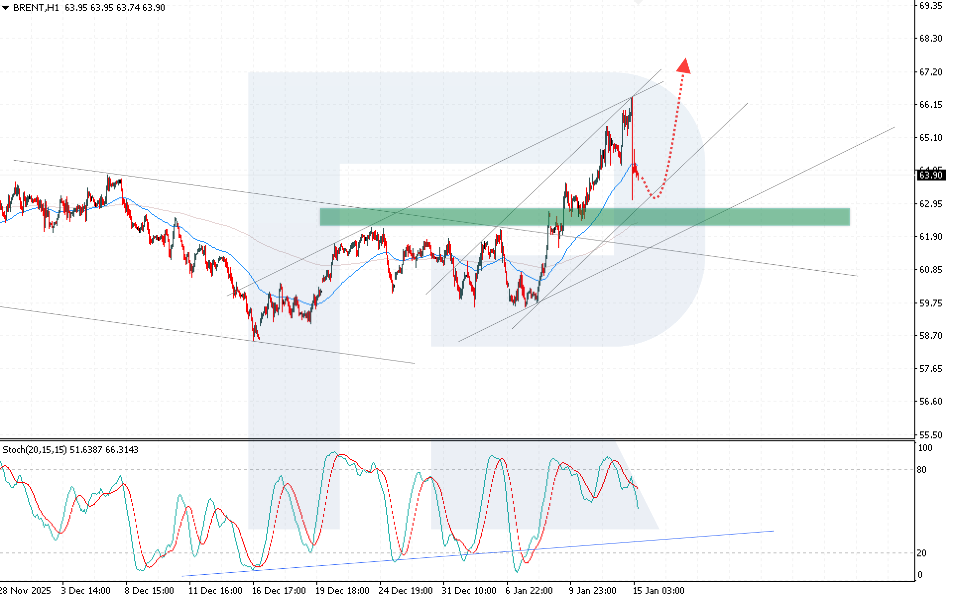 Геосаяси тәуекелдердің төмендеуі және АҚШ-тағы мұнай қорларының өсуі аясында Brent бағасының 66.45 USD деңгейінен жоғары бекіне алмауы 62.85 USD қолдау деңгейін қайта сынауға жағдай жасайды. Сонымен қатар өсуші арна шеңберіндегі ағымдағы аюлы түзету техникалық сипатта қалып отыр және 15 қаңтар 2026 жылға арналған Brent болжамы аясында 67.35 USD деңгейіне қарай ықтимал өсім алдындағы үзіліс ретінде қарастырылуы мүмкін.