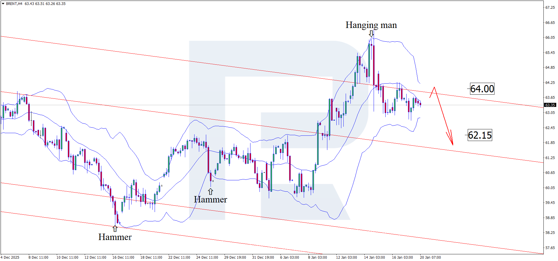 2026 жылғы 20 қаңтарға арналған Brent баға болжамы төмен бағыттағы мақсат ретінде 62.15 USD деңгейін айқындайды. Қолдау деңгейінен төмен бұзылу төмендеу импульсының күшеюіне жол ашады.