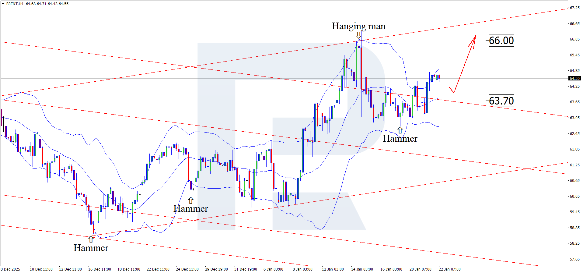 22 қаңтар 2026 жылға арналған Brent бағасы болжамы жоғары мақсат ретінде 66.00 USD деңгейін көрсетеді. Қарсылық деңгейінен жоғары бұзылу өсуші импульстың күшеюіне жол ашады.