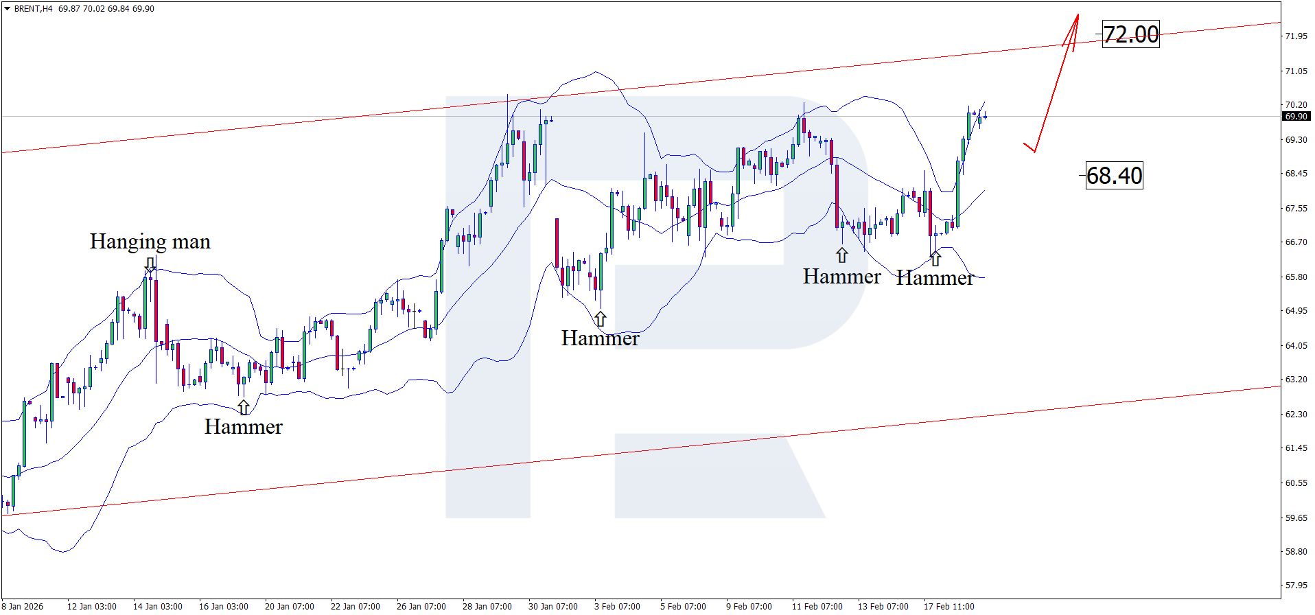 2026 жылғы 19 ақпандағы Brent бойынша фундаменталды талдау соңғы өсімнен кейін бағалар түзету қалыптастырып, барреліне шамамен 70.00 USD деңгейінде саудаланып жатқанын ескереді.