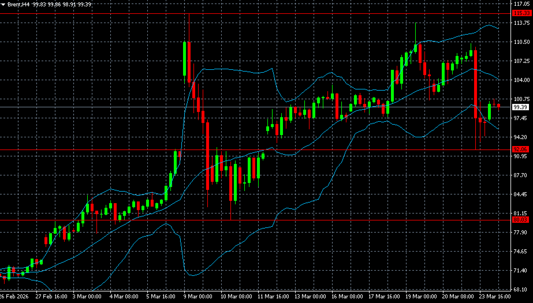 Brent бағалары алдыңғы күнгі құлдыраудан кейін Иран бойынша жаңалықтардың расталмауына байланысты қалпына келуде. 24 наурыз 2026 жылға арналған Brent болжамы 100.00 деңгейіне қайта оралу ықтималдығын жоққа шығармайды, ал одан кейінгі келесі мақсат