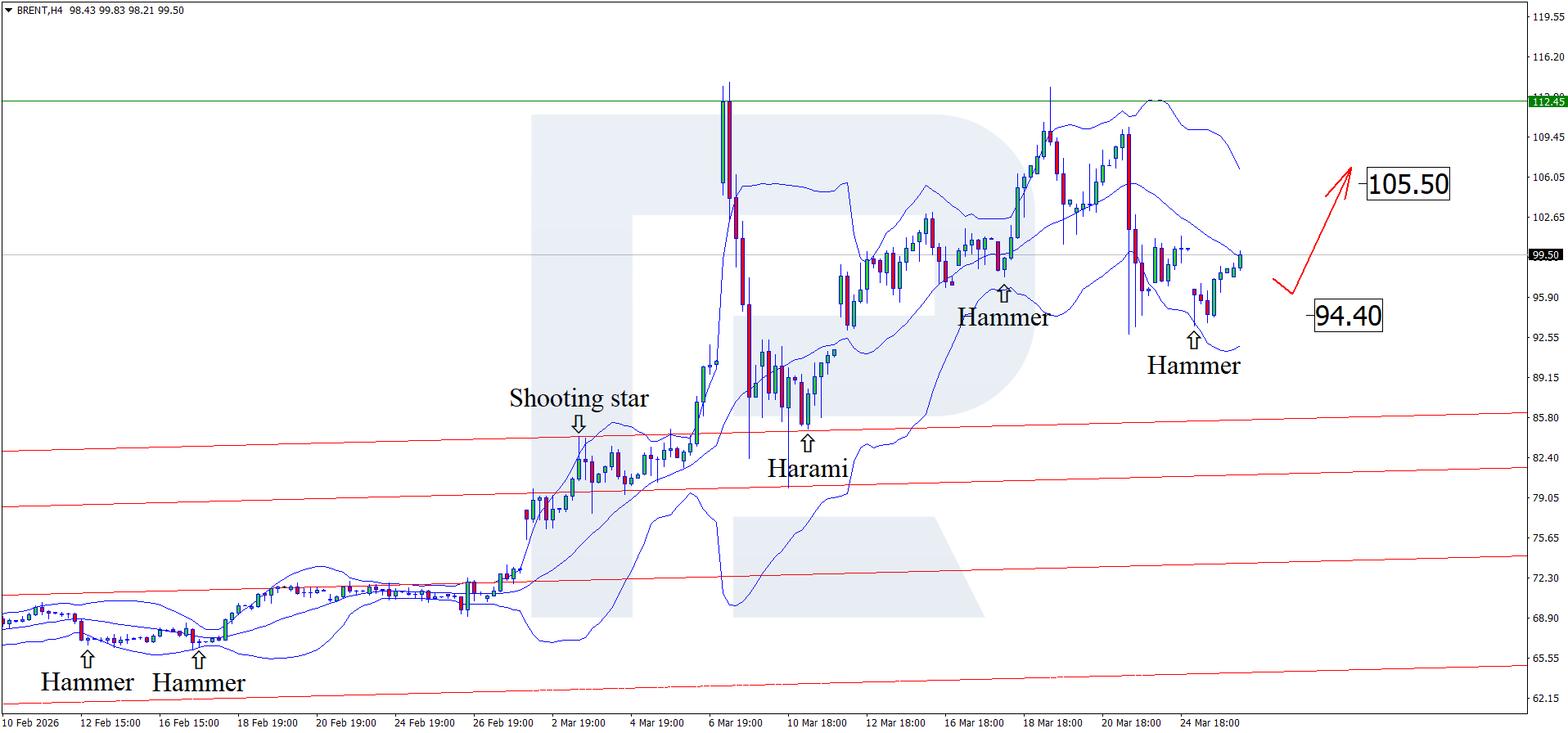 H4 графигінде төменгі Bollinger Band деңгейін сынағаннан кейін Brent бағасы Hammer кері бұрылу моделін қалыптастырды. Қазіргі кезеңде котировкалар өсу трендін жалғастыруда; түзетуден кейін баға сигналды жаңа жоғары толқын түрінде пысықтауы мүмкін.