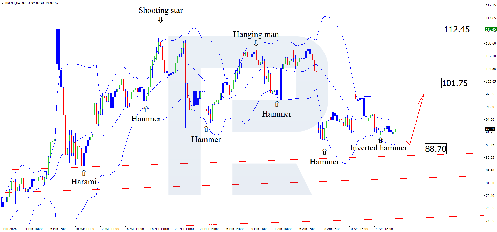 H4 графигінде Brent бағалары Bollinger Bands төменгі шекарасы маңында Inverted Hammer кері бұрылу үлгісін қалыптастырды. Осы сигнал аясында баға жоғары толқын қалыптастырып, 101.75 USD деңгейі өсу мақсаты болуы мүмкін.