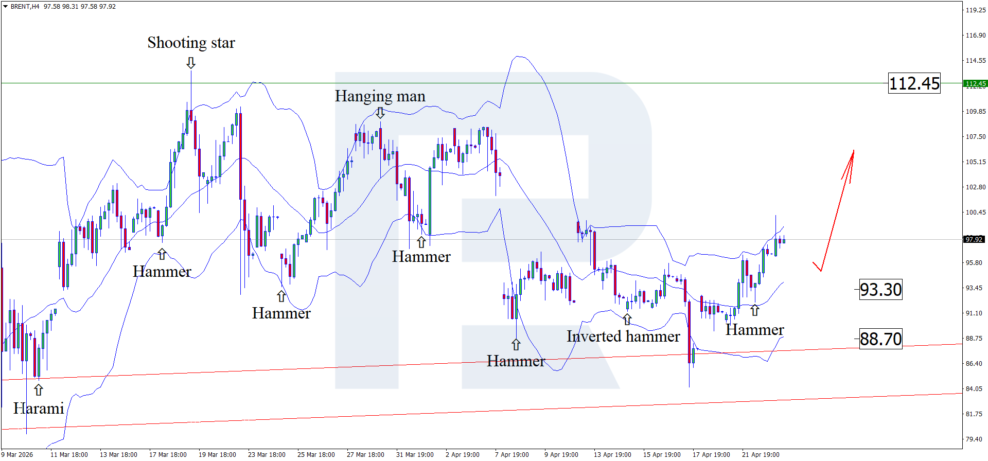 H4 графигінде Brent бағалары Bollinger Bands орта сызығы маңында Hammer кері бұрылу моделін қалыптастырды. Осы сигналға сәйкес бағалар жоғары толқынды жалғастырып, 112.45 USD қарсылық деңгейіне жетуі мүмкін.