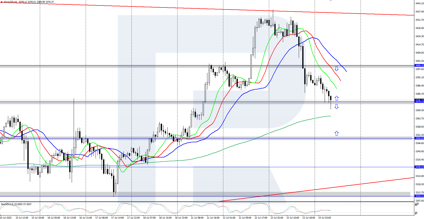 Бейсенбі күні XAUUSD бағасы төмендеді, себебі АҚШ пен негізгі сауда серіктестері арасындағы келісімдерге қатысты оптимизм алтынды "қауіпсіз актив" ретінде сатып алуға деген қызығушылықты төмендетті. Еуропалық Одақ Вашингтонмен сауда келісіміне келуге ұмтылуда, оған сәйкес АҚШ-қа импортталатын ЕО тауарларына кең көлемді 15% тариф ұсынылуда, бұл 1 тамызда күшіне енетін 30% мөлшеріндегі қатаң шараны болдырмауға бағытталған.