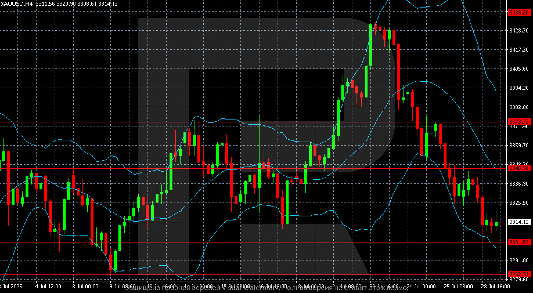 H4 графигінде Алтын (XAUUSD) котировкалары 3 345 доллар деңгейіндегі негізгі қолдаудан төмен түсті – бұл құлдырауды үдетті. Ең жақын сұраныс аймағы – 3 300–3 301 доллар, ал одан кейінгі күшті қолдау – 3 282. Bollinger Bands индикаторының арнасы төмен бағытта кеңеюде, бұл құбылмалылықтың артуын және «аюлық» импульстің күшеюін көрсетеді.