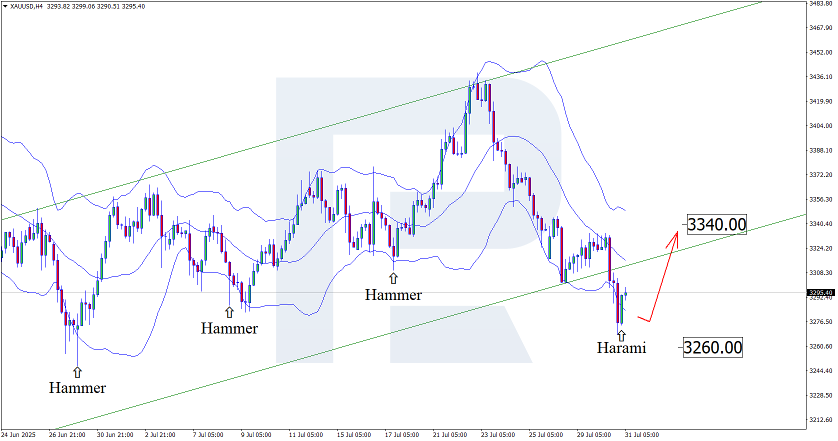 H4 графигінде XAUUSD котировкалары Bollinger Bands индикаторының төменгі сызығына жақын жерде Harami атты кері бұрылу моделін құрды. Бұл үлгі бойынша бағалар жоғары қозғалысты бастауы мүмкін. XAUUSD котировкалары өсу арнасынан шыққанымен, арнаға қайта оралу өсімнің жалғасуына жол ашуы мүмкін.