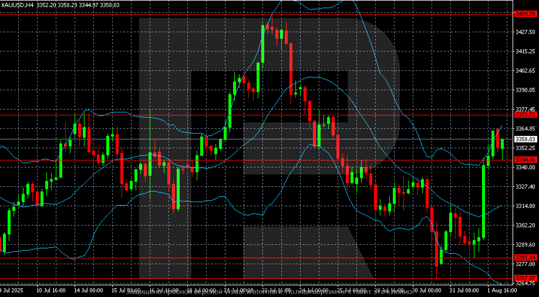H4 (төрт сағаттық) графигінде алтын бағасы 3 358 АҚШ доллары шамасында саудалануда. Бұл – 31 шілдеде басталған күшті өсу қозғалысының жалғасы. Сол сәтте баға 3 267 қолдау деңгейінен серпіліп, бірнеше шырақ ішінде 3 281 және 3 344 кедергілерінен жоғары шықты.