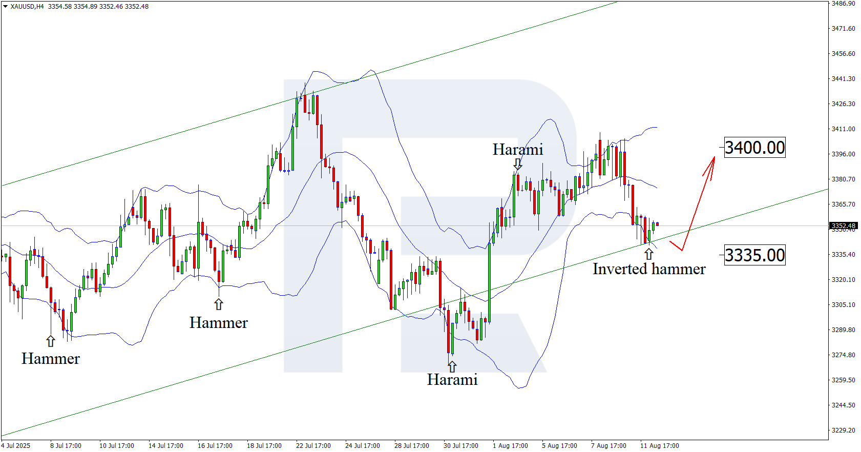 H4 графигінде XAUUSD бағалары Bollinger Bands төменгі шекарасына жақын жерде “Inverted Hammer” кері бұрылу үлгісін қалыптастырды. Осы кезеңде бағалар үлгі берген сигналдан кейін жоғары толқынды қалыптастыруда. XAUUSD котировкалары өсіп келе жатқан каналдың ішіне қайта оралғанын ескерсек, өсу үрдісі жалғасуы мүмкін. Ағымдағы өсу мақсаты – 3 400 АҚШ доллары қарсылық деңгейі.