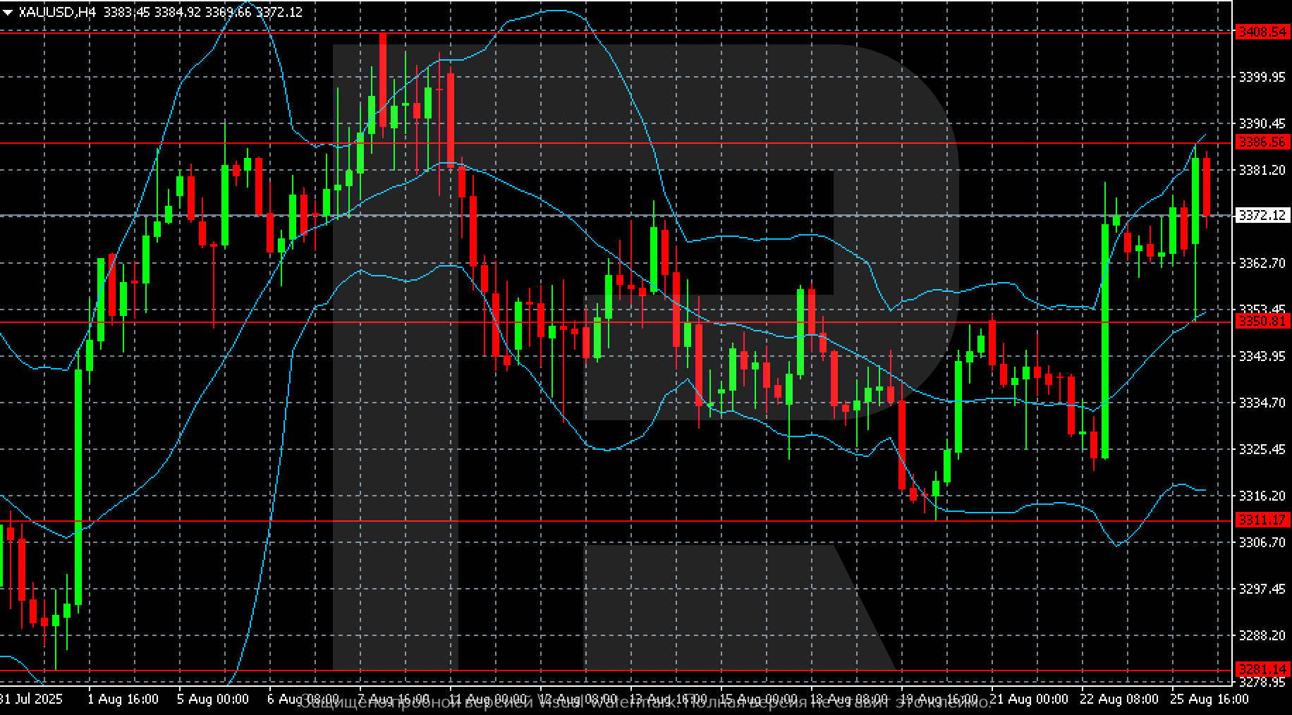 H4 графигінде алтын (XAUUSD) өсімін жалғастырып, бір унция үшін 3,389 АҚШ долларына жетті. Тамыз айының ортасынан бастап котировкалар 3,310–3,350 диапазонында ауытқып, осы аймақта қолдау аймағы қалыптасты. Қазіргі қалпына келу осы аумақтан басталды.