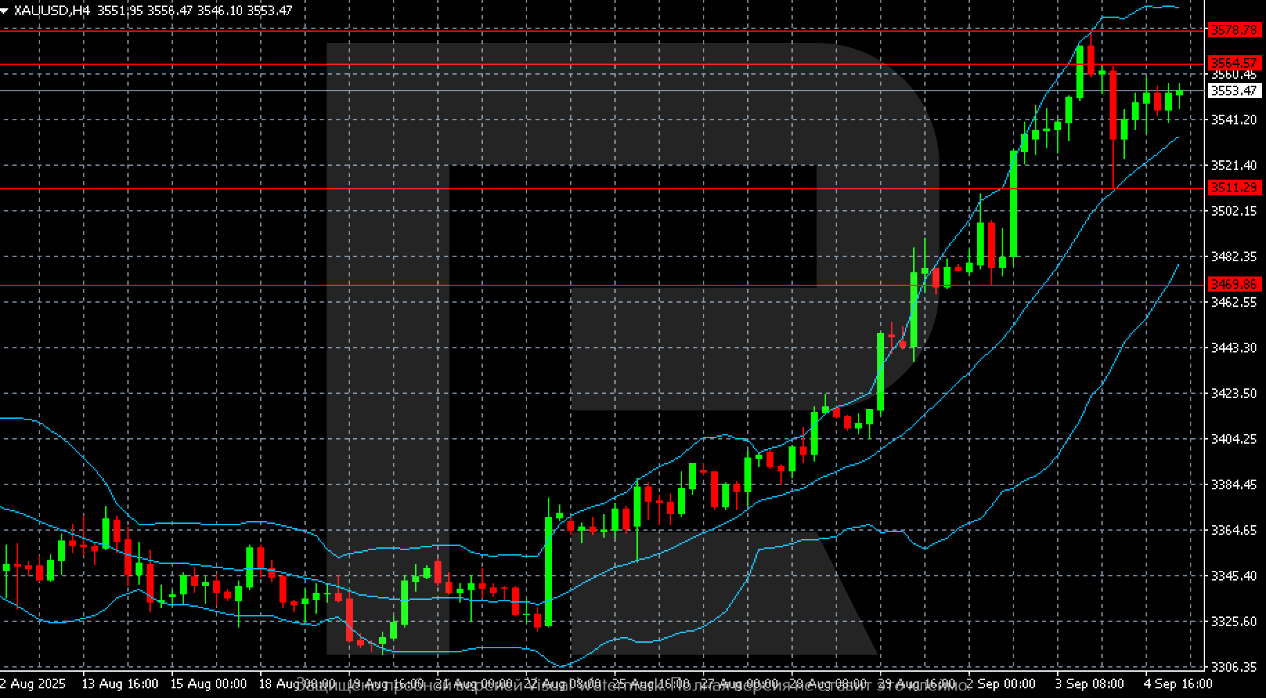 H4 графигінде алтын (XAUUSD) бағасы сенімді түрде жоғары бағытта қозғалып тұр. Тамыз айының ортасында шоғырланғаннан кейін котировкалар 3,400 және 3,469 қарсылық деңгейлерінен жоғары бұзылып, жаңа шыңдарға шықты. 5 қыркүйекте баға 3,578 аймағына жетіп, қазір 3,550–3,560 диапазонында шоғырлануда.