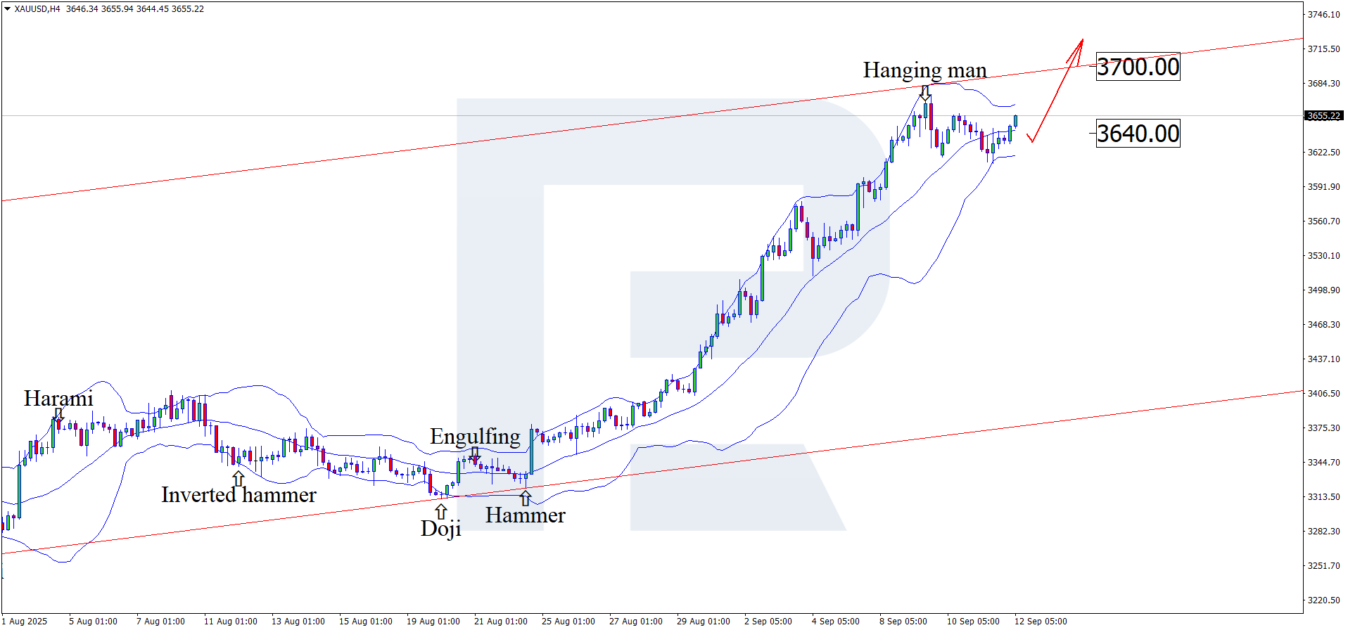 H4 графигінде XAUUSD бағасы жоғарғы Bollinger Band маңында «Hanging Man» кері бұрылу үлгісін қалыптастырды. Қазіргі кезде үлгі сигналына сәйкес түзету толқынын аяқтауда. XAUUSD котировкалары өрлемелі арна ішінде қалып отырғанын және геосаяси факторларды ескерсек, өрлемелі трендтің жалғасуы ықтимал. Түзетудің мақсаты 3,640 USD деңгейі болуы мүмкін.