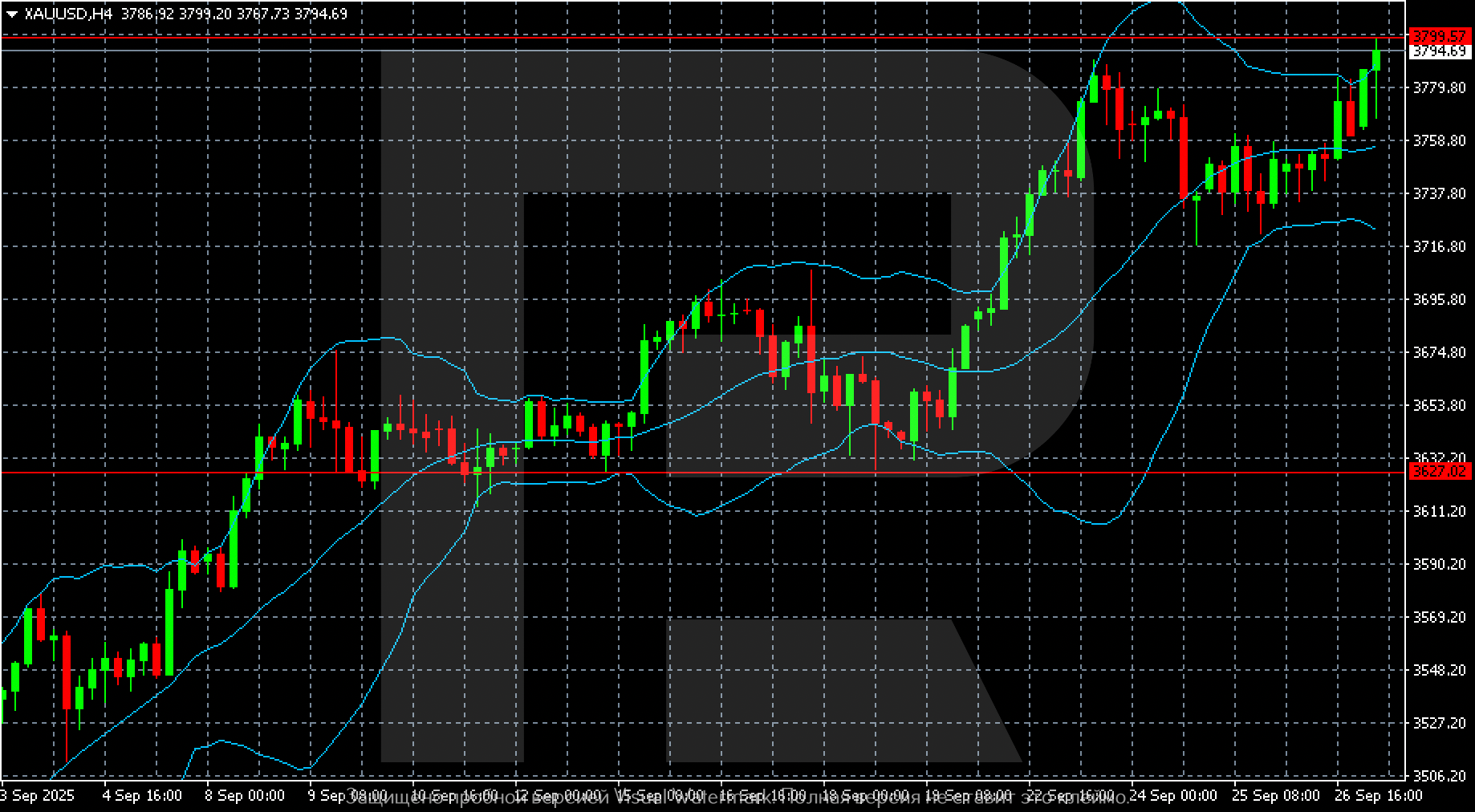 29 қыркүйекке қарай котировкалар унциясына 3,794–3,799 деңгейіне жетті. Бағалар жаңа локалды шыңдарды орнатып, негізгі қарсылық деңгейіне жақындады. Bollinger Bands жоғары бағытталған, бұл трендтің қуатын және құбылмалылықтың өсуін растайды.