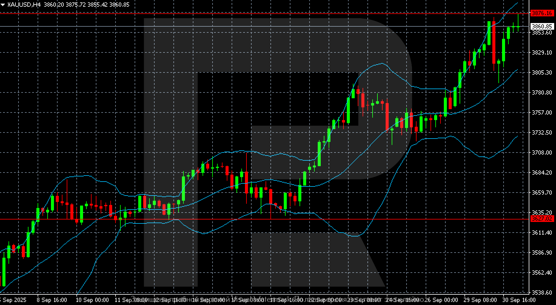 H4 графигінде XAUUSD бағасы жоғары қозғалысын жалғастыруда. 3 730–3 770 аймағында шоғырланғаннан кейін, котировкалар жоғары серпін алып, 3 860–3 875 аймағына дейін өсті. Жергілікті максимум 3 876 деңгейінде тіркелді, бұл тарихи рекордқа сәйкес келеді.