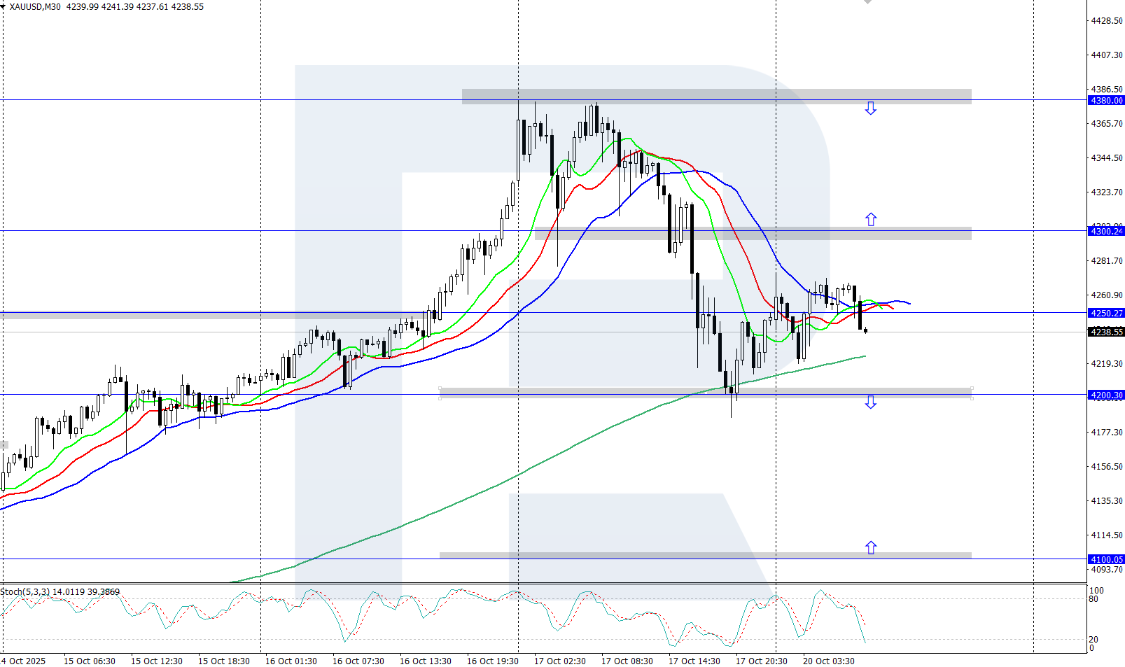 Өткен аптадағы күшті ралли кезінде жаңа тарихи максимум — 4,380 АҚШ долларына жеткеннен кейін, XAUUSD бағасы шамамен 4,250 АҚШ долларына дейін төмендеді. Толығырақ 2025 жылғы 20 қазан күнгі талдауда.