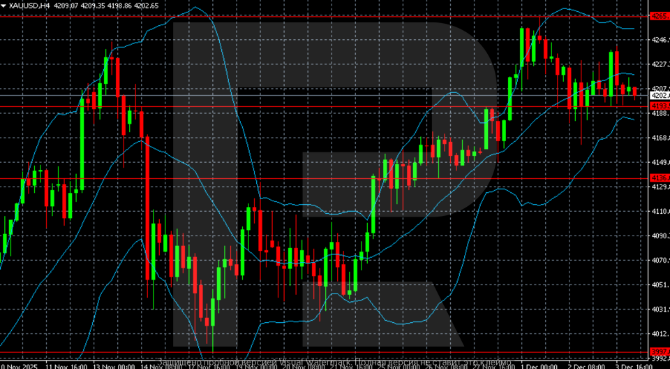 Алтын (XAUUSD) бағасы унциясына 4,210 USD деңгейінен жоғары нығайып, алты апталық максимумға жақын сақталуда. Инвесторлар қараша айындағы әлсіз ADP деректерінен кейін келесі аптада ФРЖ мөлшерлемені төмендетеді деген ставкаларын арттыруда.