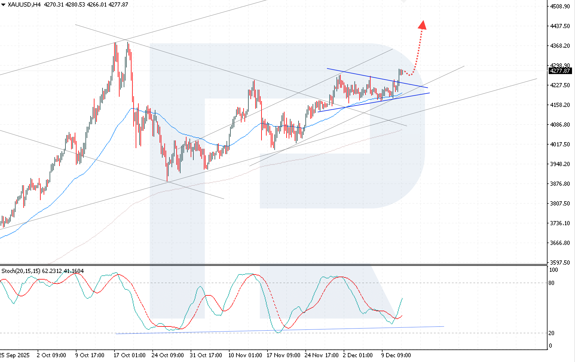 XAUUSD негізгі қарсыласу деңгейінен жоғары серпілістен кейін өсуші импульсті сақтап тұр, бұл ФРЖ саясатын одан әрі жұмсарту күтулерінің артуымен қолдау табуда. Ағымдағы баға — 4,277 USD. Толығырақ — 2025 жылғы 12 желтоқсан арналған талдауымызда.