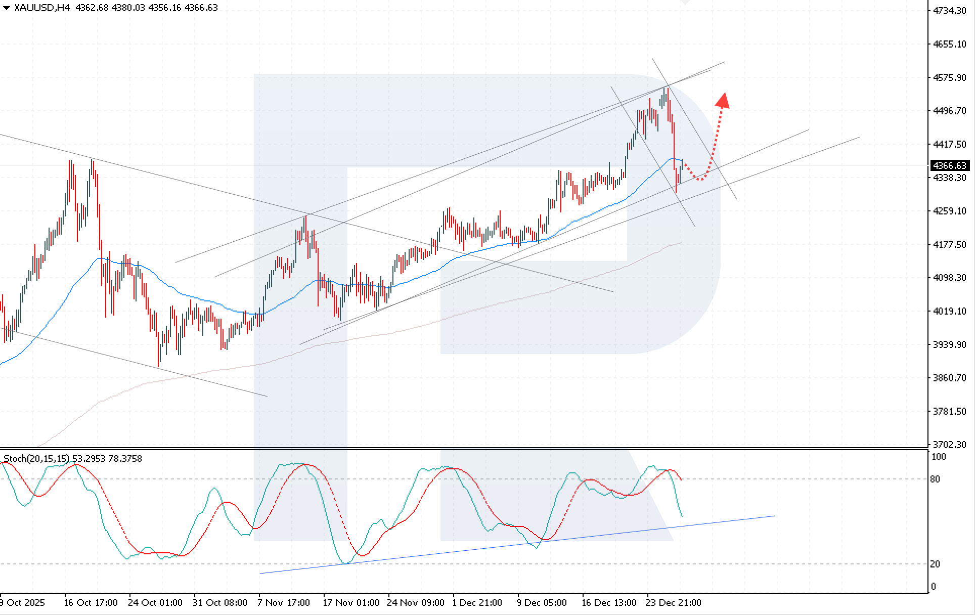Бағалар 4,425 USD қарсылық деңгейінен сенімді түрде жоғары бекісе, өсу сценарийіне техникалық негіз одан әрі күшейеді. Мұндай жағдай төмендеуші түзету арнасының жоғарғы шекарасынан шығуды растап, жоғары қозғалыстың жалғасуына жағдай жасайды.