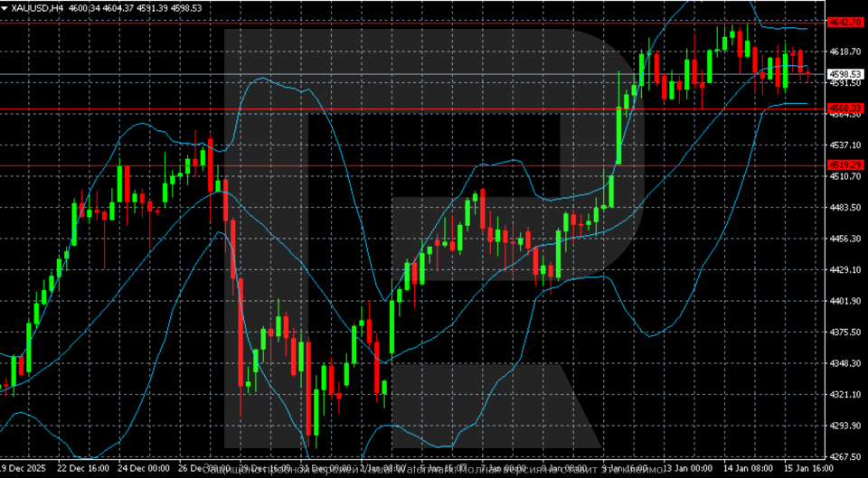 Қаңтардың басында жоғары бағытта жеделдегеннен кейін бағалар 4,520–4,560 аймағынан сенімді түрде жоғары бұзылып, шамамен 4,640 деңгейінде жаңа максимум қалыптастырды. Бұдан кейін түзету болып, бүйірлік қозғалысқа ауысу байқалды. Қазіргі уақытта котировкалар 4,560–4,620 диапазонында тербеліп, трендтегі үзілісті және позициялардың қайта бөлінуін көрсетуде. Бағалар Bollinger Bands орта сызығынан жоғары қалуда.