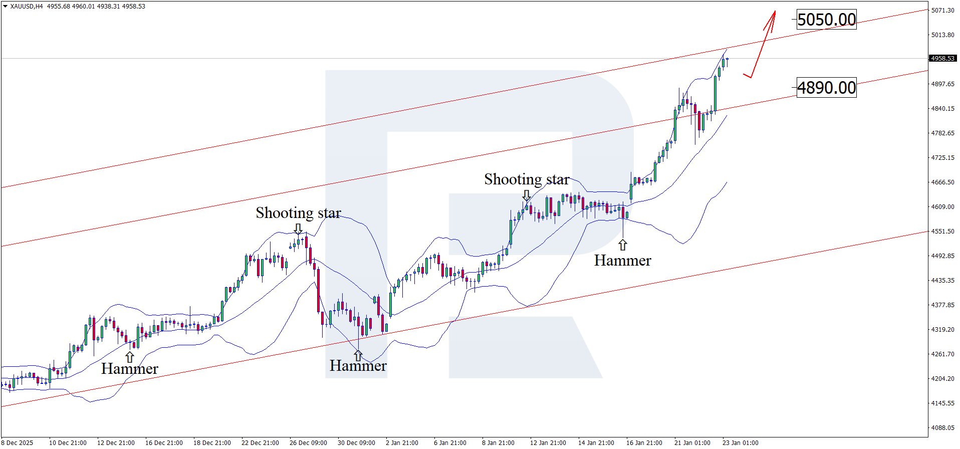 XAUUSD котировкалары тағы бір баға рекордын орнатып, 4,957 USD деңгейін тестілеуде, ал АҚШ экономикасының әлсіз көрсеткіштері аясында 5,000 USD деңгейінен жоғары өсім мүмкін. Толығырақ — 2026 жылғы 23 қаңтар күнгі талдауымызда.
