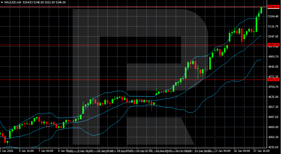 H4 графигінде XAUUSD айқын және орнықты өсуші тренд қалыптастырды. Қаңтар айының басынан бері баға жүйелі түрде жоғары максимумдар мен жоғары минимумдар қалыптастырып, сатып алушылардың басымдығын растап келеді. 4,600–4,650 аймағындағы қысқа консолидациядан кейін нарық импульстік раллиге өтті, ол айдың екінші жартысында айтарлықтай жеделдеді.