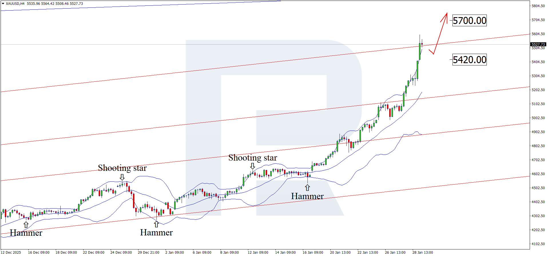 H4 графигінде XAUUSD төменгі Bollinger Bands маңында Hammer қайтарым үлгісін қалыптастырды. Қазіргі кезеңде котировкалар осы сигналға сәйкес өсуші толқынды дамытуды жалғастыруда. XAUUSD бағасы өсуші арнаның шегінен шыққандықтан, келесі психологиялық өсім мақсаты 5,700 USD деңгейі болуы мүмкін.
