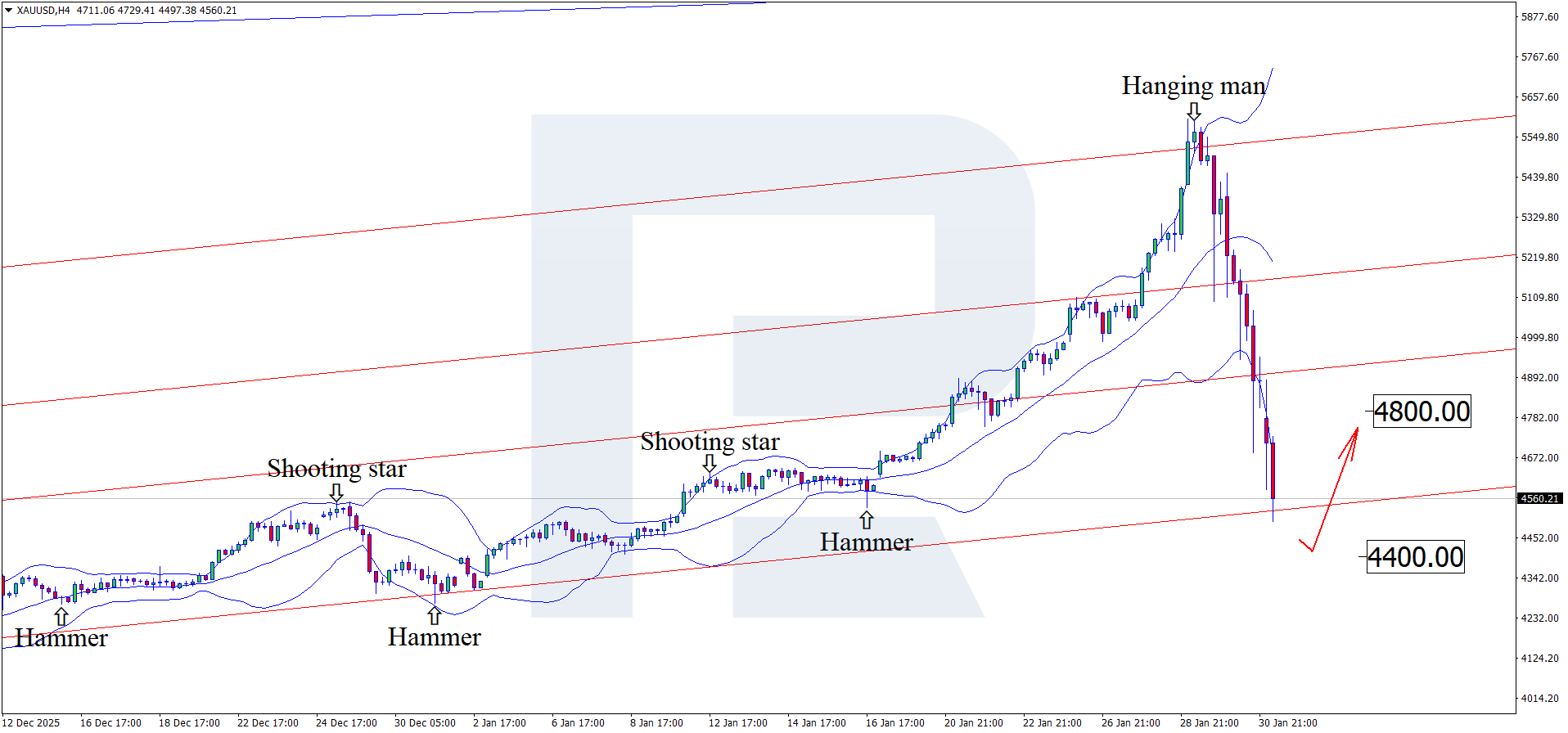 H4 графигінде XAUUSD бағасы жоғарғы Bollinger Bands маңында Hanging Man кері бұрылу үлгісін қалыптастырды. Қазіргі кезеңде баға осы сигналға сәйкес түзету толқынын дамытуды жалғастыруда. XAUUSD котировкалары өсуші арна ішінде кері қайтқандықтан, төмендеу мақсаты ретінде 4,400 USD қолдау деңгейі қарастырылуда.