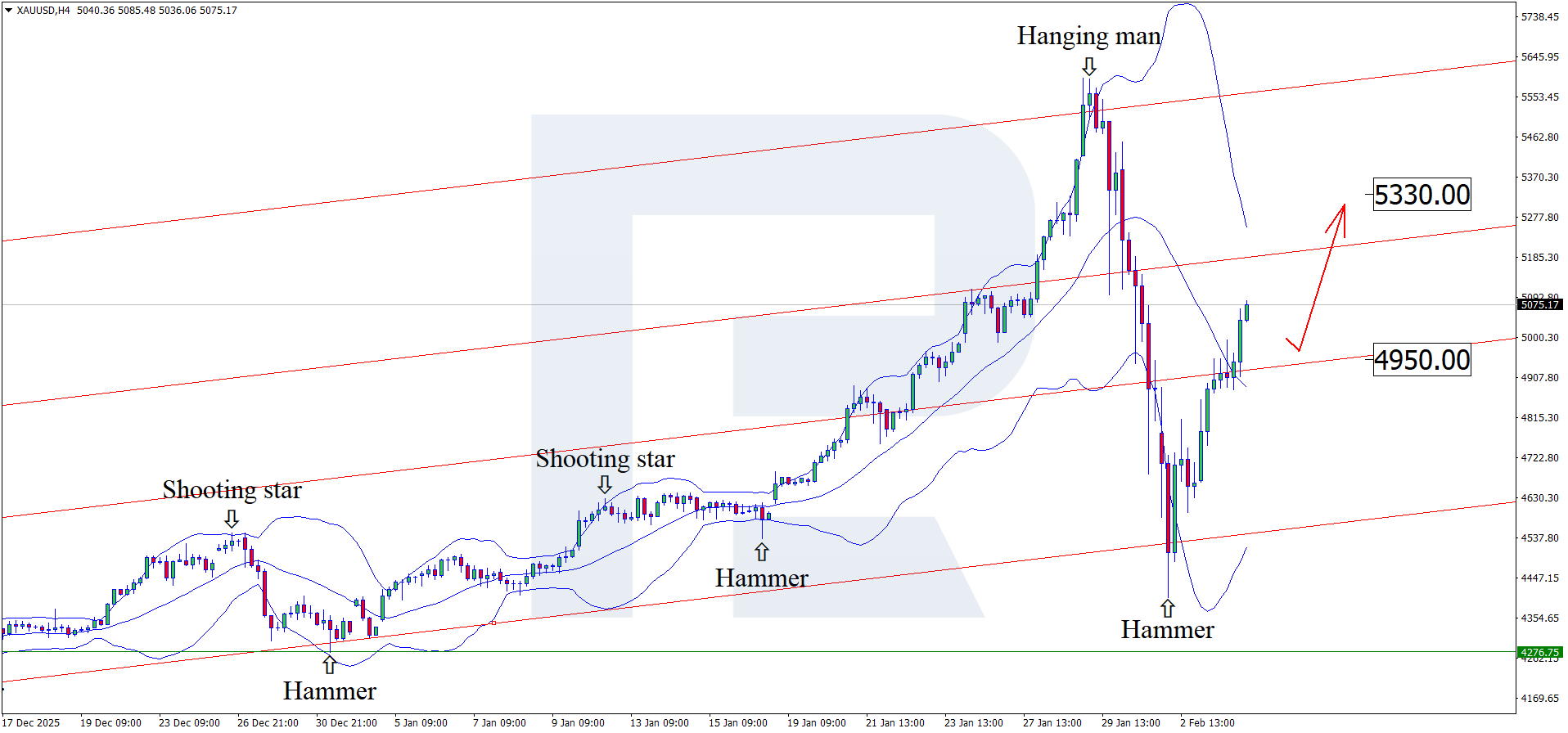 4,440–4,450 аймағында минимум қалыптастырғаннан кейін алтын техникалық қалпына келу фазасына өтті. 5,150 деңгейінен жоғары бекітілу дүрбелеңге негізделген сатылымнан кейін өсуші импульсті растап, 5,330 бағытына қозғалысқа жол ашады.