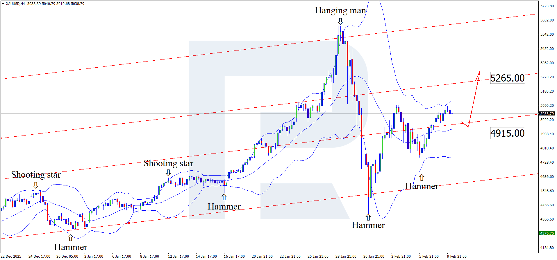 H4 графигінде XAUUSD бағалары төменгі Bollinger Band маңында Hammer кері бұрылу үлгісін қалыптастырды және осы сигнал аясында жоғары қозғалысын жалғастыруы мүмкін. XAUUSD котировкалары өсуші арна ішінде қалғандықтан, келесі мақсат 5,265 USD деңгейі болуы ықтимал.