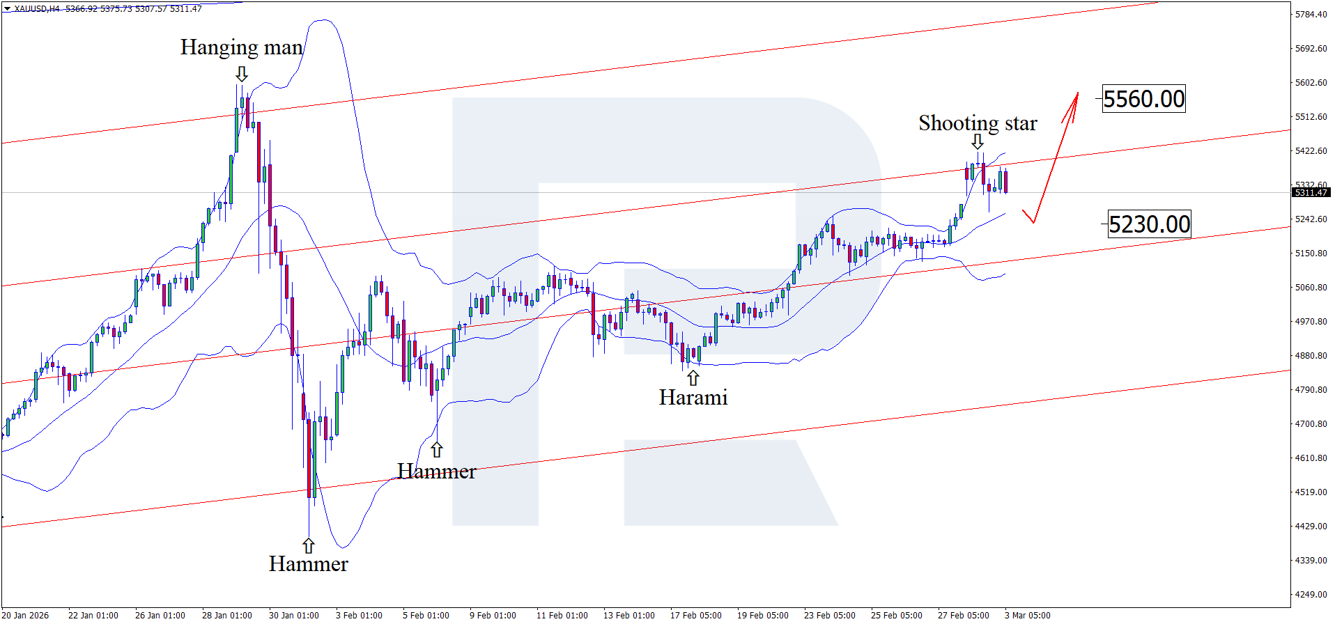 H4 графигінде XAUUSD бағамдары жоғарғы Bollinger Band маңында Shooting Star кері бұрылу моделін қалыптастырды. Қазіргі кезеңде баға түзету толқынын жалғастырып, модель іске асқан жағдайда қысқа мерзімді шегініс көрсетуі мүмкін. XAUUSD өсу арнасының ішінде қалып отырғандықтан, алғашқы түзету мақсаты 5,230 USD деңгейінде орналасқан.