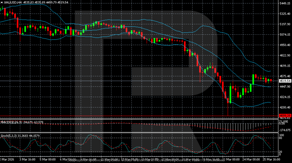 Алтын (XAUUSD) 4,519 USD деңгейіне дейін төмендеді, ал нарықтың назары әлі де Таяу Шығыс жаңалықтарында. 2026 жылғы 26 наурыз арналған талдауымыздан толығырақ біліңіз.