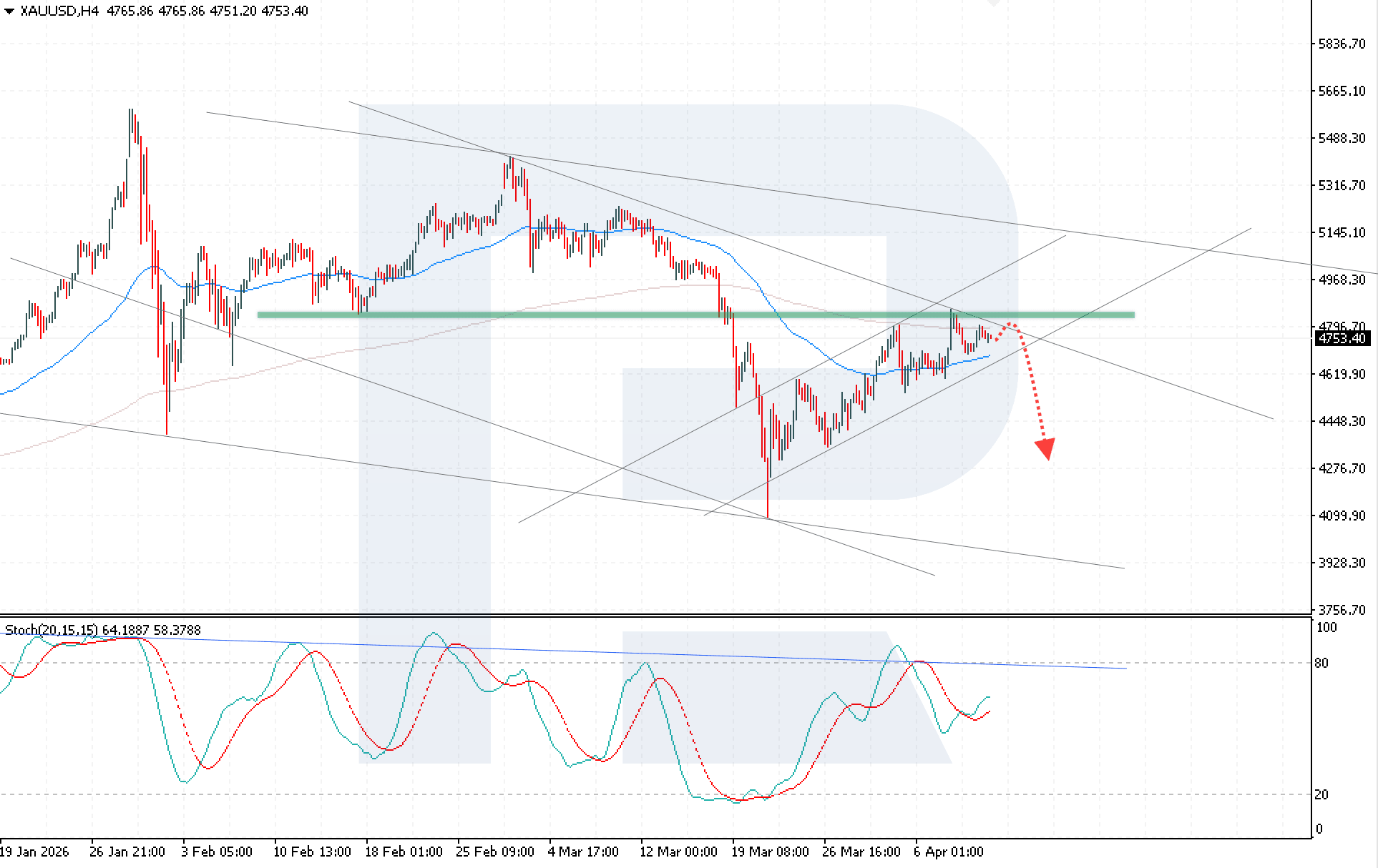 Жалпы техникалық көрініс аюлар жағында қалып отыр. Stochastic Oscillator қарсылық сызығынан кері серпіліс қалыптастырып, төмендеу қозғалысының даму тәуекелін көрсетеді. Қосымша растау индикатордың overbought аймақтан шығуынан байқалады, бұл сатып алушылар импульсының әлсірегенін білдіреді. Бұқалық арнаның төменгі шекарасынан төмен бұзылу және 4,615 USD деңгейінен төмен бекіну котировкалардың әрі қарай төмендеуін растайды.