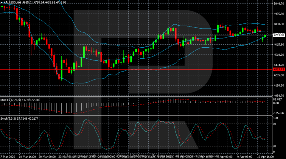 Алтын (XAUUSD) өсуге тырысуда, бірақ мұнай бағасының жаңа өсімі және жоғары нарықтық шиеленіс оның қарқынды нығаюына кедергі болуы ықтимал. Бүгінгі, 13 сәуір 2026 жылға арналған XAUUSD болжамы 4,700–4,800 диапазонында бүйірлік қозғалыстың жалғасуын жоққа шығармайды.