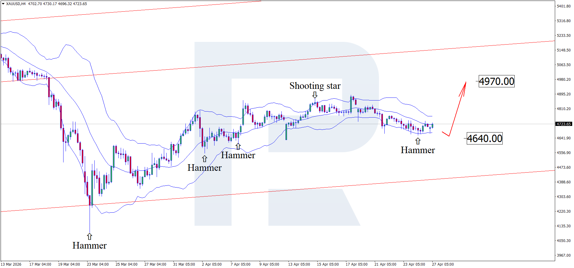 H4 графигінде XAUUSD бағалары Bollinger Bands төменгі шекарасы маңында Hammer кері бұрылу моделін қалыптастырды және осы сигнал бойынша жоғары толқынды жалғастыруы мүмкін. XAUUSD бағалары өсуші арнада қалуда, сондықтан 4,970 USD қарсылық деңгейі жоғары мақсат ретінде қарастырылады.