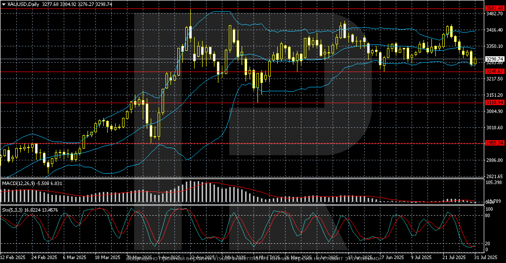 Gold (XAUUSD) шілде айын құбылмалылықпен аяқтады, бірақ орта мерзімді 3,245–3,350 диапазонында қалды. Microsoft пен Meta-ның мықты кіріс есептері және АҚШ-тың ЕО мен Оңтүстік Кореямен сауда келісімдеріне қол қоюы аясында қауіпсіз активтерге деген сұраныс төмендеді. Алтынға қолдау — ФРЖ тарапынан мөлшерлемені төмендету үміті және Үндістан, Иран және Бразилияға қарсы тарифтік қысымнан туындады. Апталық минимум — 3,246, максимум — 3,347.