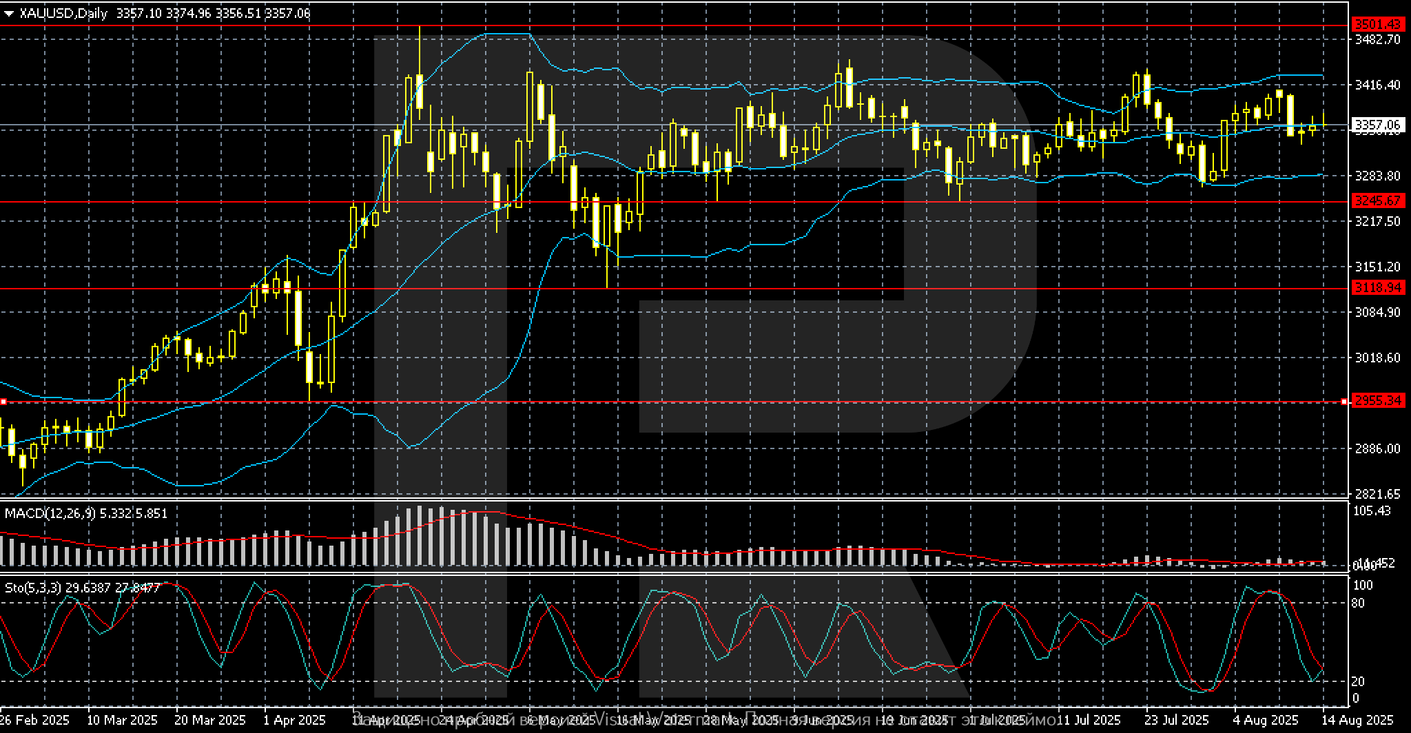 Күндік графикте алтын (XAUUSD) бағасы бір унция үшін шамамен 3 357 маңында қалып, диапазон ішінде саудалануда. Бұл диапазон 2025 жылдың мамыр айының ортасынан бері өзгеріссіз, жоғарғы шегі 3 416–3 439 аймағында, ал төменгі шегі шамамен 3 283–3 300 деңгейінде орналасқан.