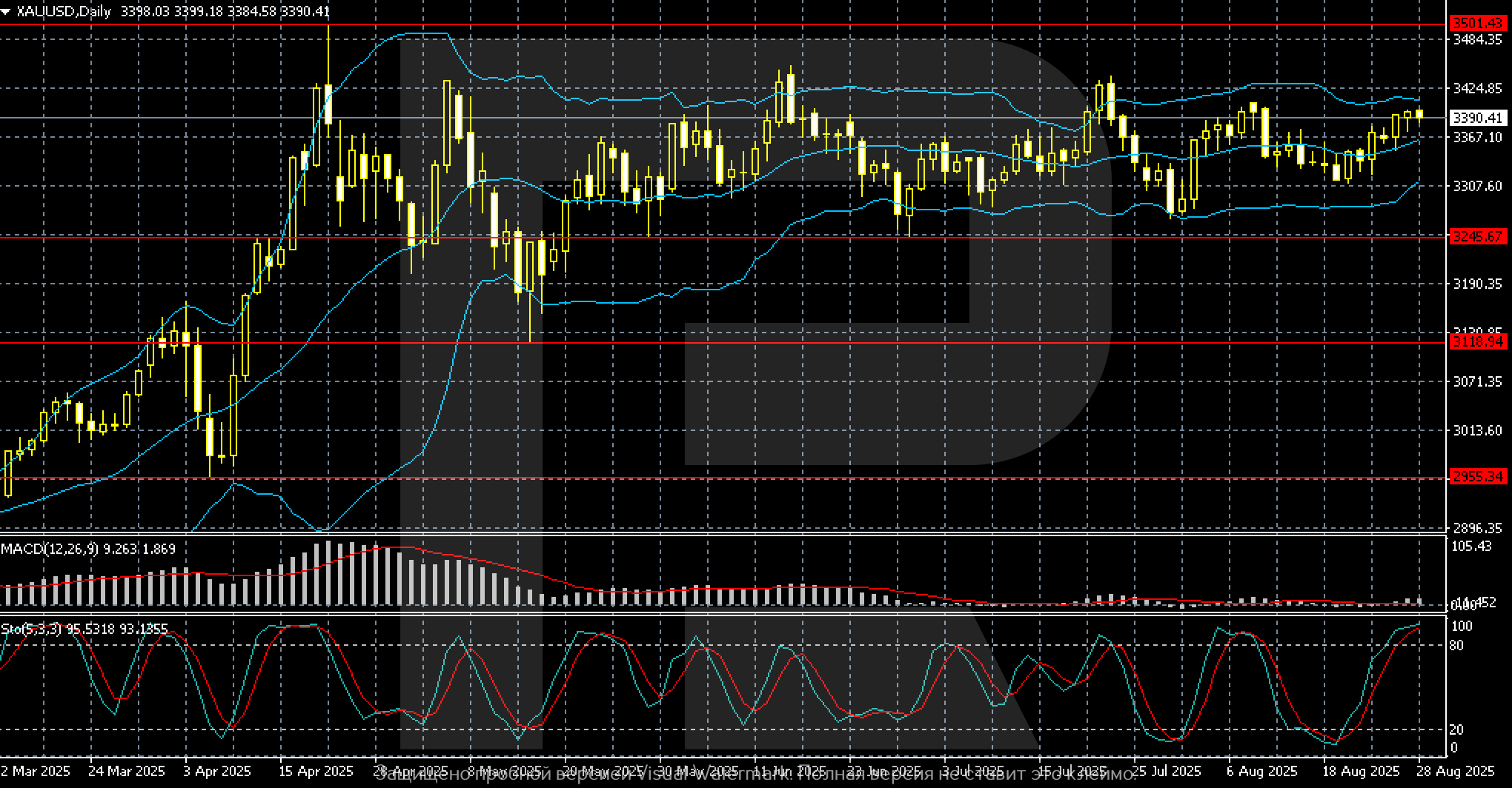 Диапазонның жоғарғы шекарасы — 3 420–3 439 аймағы, негізгі қарсылық болып тұр. Шілде мен тамыздағы осы аймақтан жоғары серпіліс әрекеттері сәтсіз аяқталды. Қолдау деңгейлері 3 350 және 3 245 маңында, олар терең түзетулердің алдын алды.