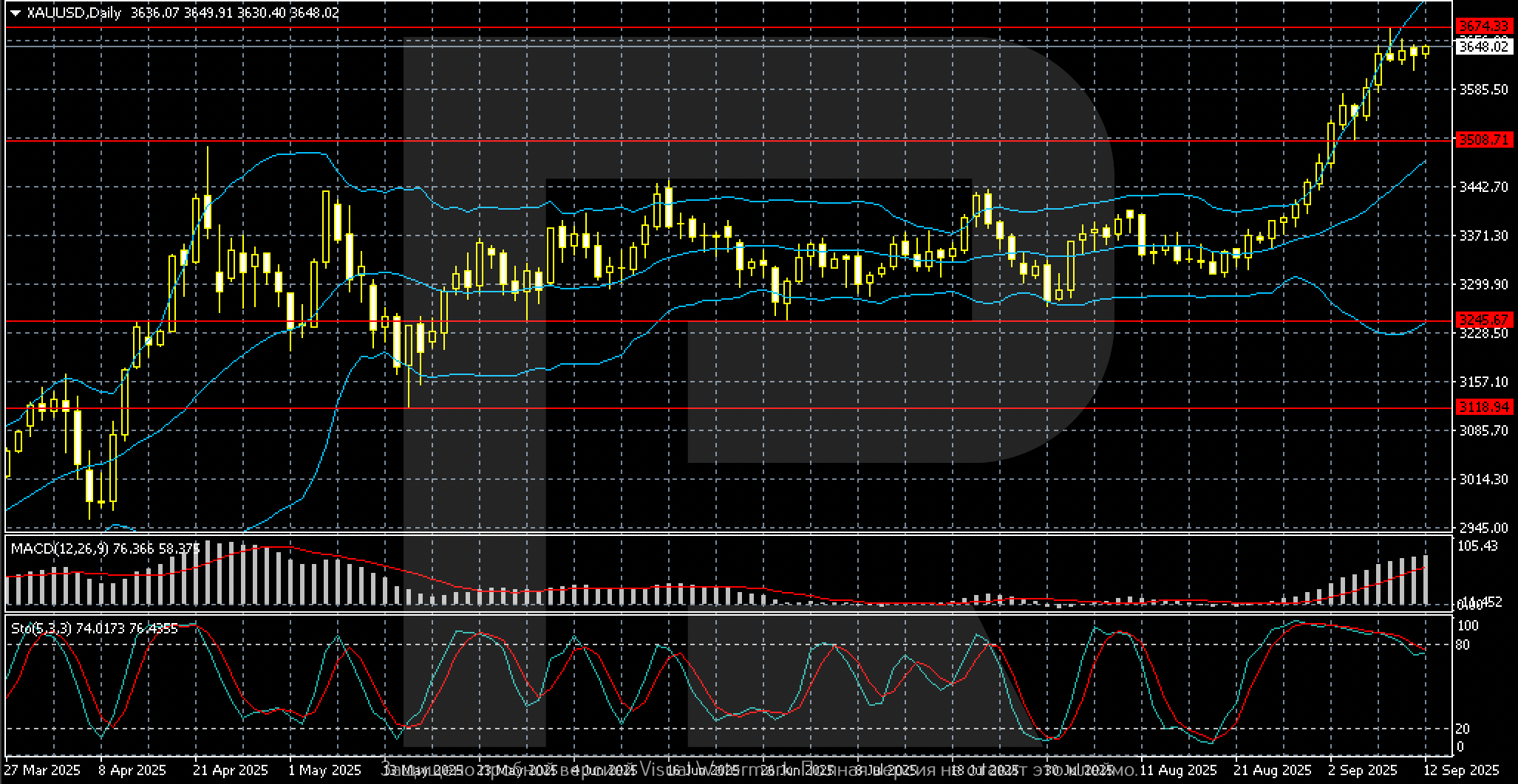Күндік графикте алтын (XAUUSD) шамамен 3,648 АҚШ доллары деңгейінде саудалануда, тамыз айының ортасынан бері күшті раллиден кейін. Бағалар 3,440 деңгейінен көтеріліп, жаңа максимумдарға – 3,674-ке дейін жетіп, бірнеше ай бойы 3,245–3,508 диапазонында ұстап тұрған ұзақ консолидация фазасынан шықты.