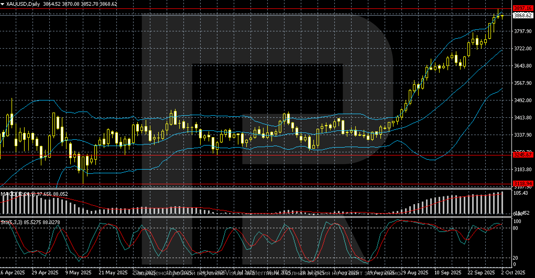 Техникалық индикаторлар қозғалыстың күшін растайды. MACD жоғары қарай өсіп тұр, гистограмма кеңейіп, тұрақты импульсті көрсетуде. Баға Bollinger Bands жоғарғы шекарасында тұр, бұл шамадан тыс сатып алынған жағдайды білдіреді. Stochastic те 85–88 аймағында, бұл қысқа мерзімді түзету ықтималдығын арттырады.