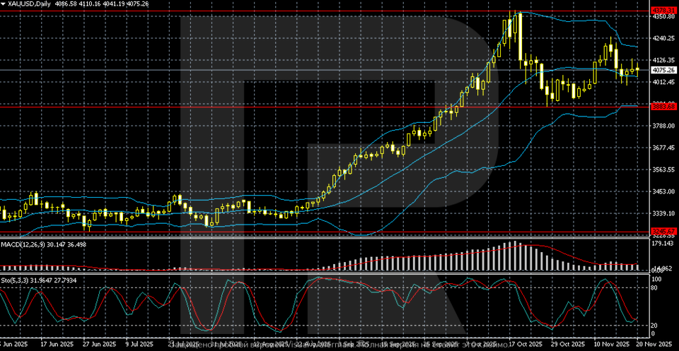 Күндізгі графикте алтын (XAUUSD) 4,378 тарихи максимум маңында қалыптасқан ұзақ мерзімді жоғары бағыттағы трендті көрсетеді. Осы қарсылықтан кейін баға күрт төмендеп, қыркүйек пен қазан айындағы күшті раллиден кейін түзету кезеңіне өтті. Қазіргі уақытта шамдар 4,050–4,150 диапазонында тұрақтанып, негізгі 3,883 қолдауынан жоғары консолидация аймағын қалыптастырды.