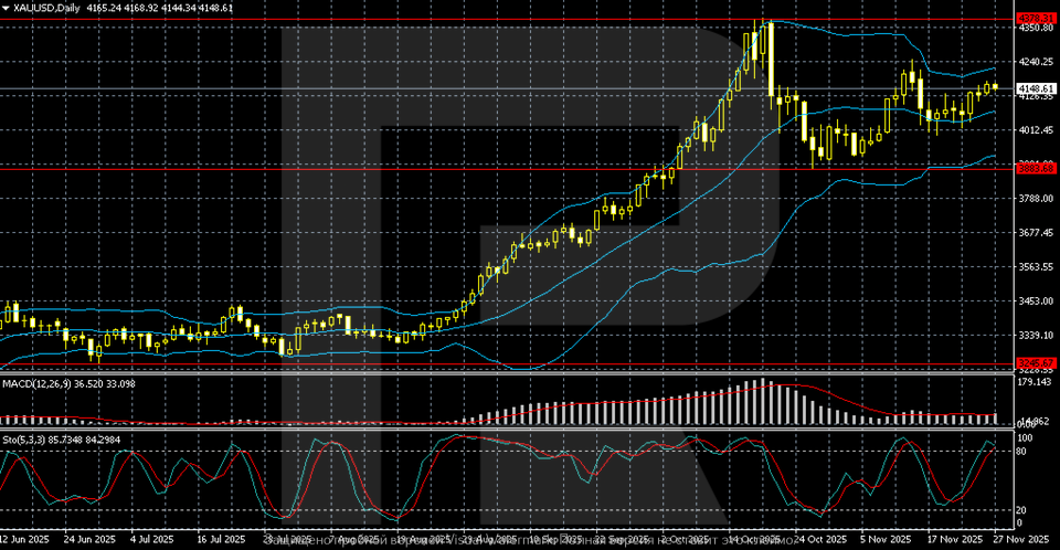 Фундаменттік фон алтын үшін тұрақты түрде оң болып отыр. Алтын (XAUUSD) аптаны екі апталық максимум маңында аяқтап, ФРЖ-ның желтоқсандағы мөлшерлеме төмендету күтуінің 80% ықтималдығын бағалауда. Бұл көрсеткіштерге қарамастан, жұмыссыздық өтінімдері мен төзімді тауарлар тапсырыстары жақсы шықты. Кевин Хассеттің ФРЖ төрағалығына басты үміткер болуы «dovish» күтулерді күшейтті. Алтын төртінші ай қатарынан өсіп, жылдық есеппен шамамен 60% қымбаттады. Нарық 4,050–4,150 диапазонында тұрақты консолидацияда.