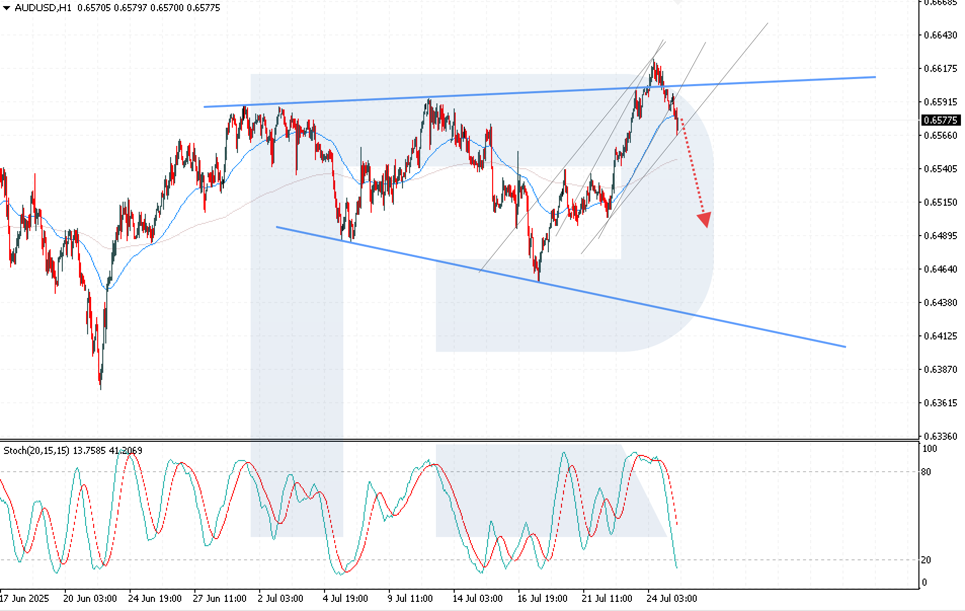 AUDUSD бағамы төмендеп жатыр, себебі АҚШ-тың күшті еңбек нарығына қатысты деректері долларды қолдап отыр. Ағымдағы баға 0.6577 деңгейінде. Толығырақ 2025 жылғы 25 шілде күнгі талдауымыздан оқыңыз.