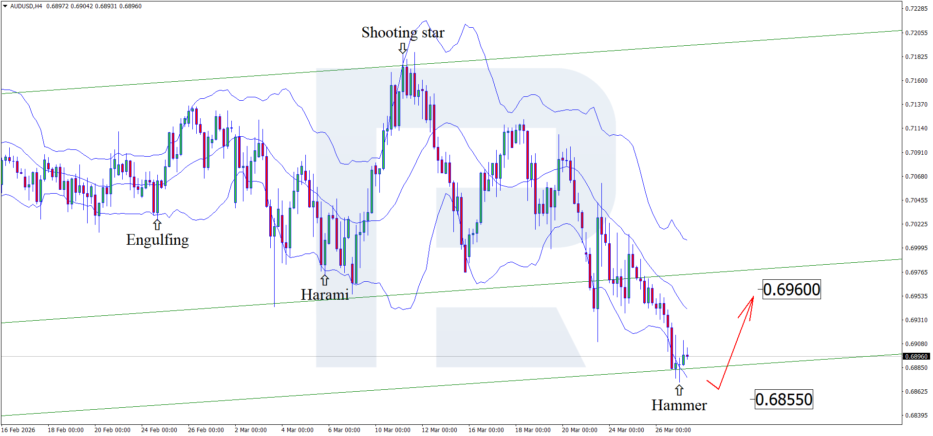 27 наурыз 2026 жылға арналған AUDUSD болжамы сондай-ақ баламалы нарық сценарийін де ескереді: котировкалар өсімге дейін жақын қолдау деңгейі 0.6855-ке қарай төмен толқын қалыптастыруы мүмкін.
